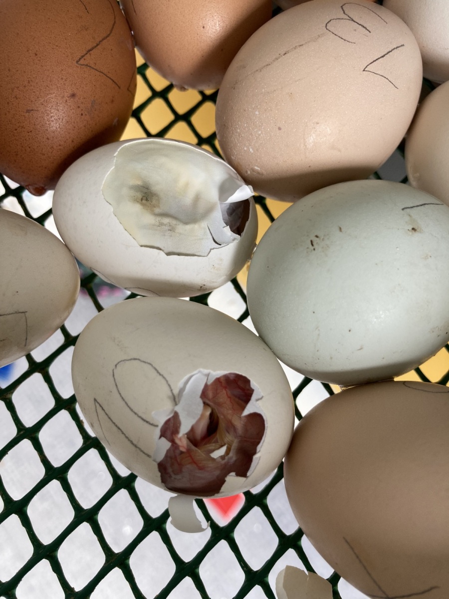 21 jours plus tard, des poussins ont commencé à casser leurs coquilles. Le mardi 20 mai, nous avions 11 poussins dans notre éleveuse avec une lampe chauffante, une mangeoire et un abreuvoir.