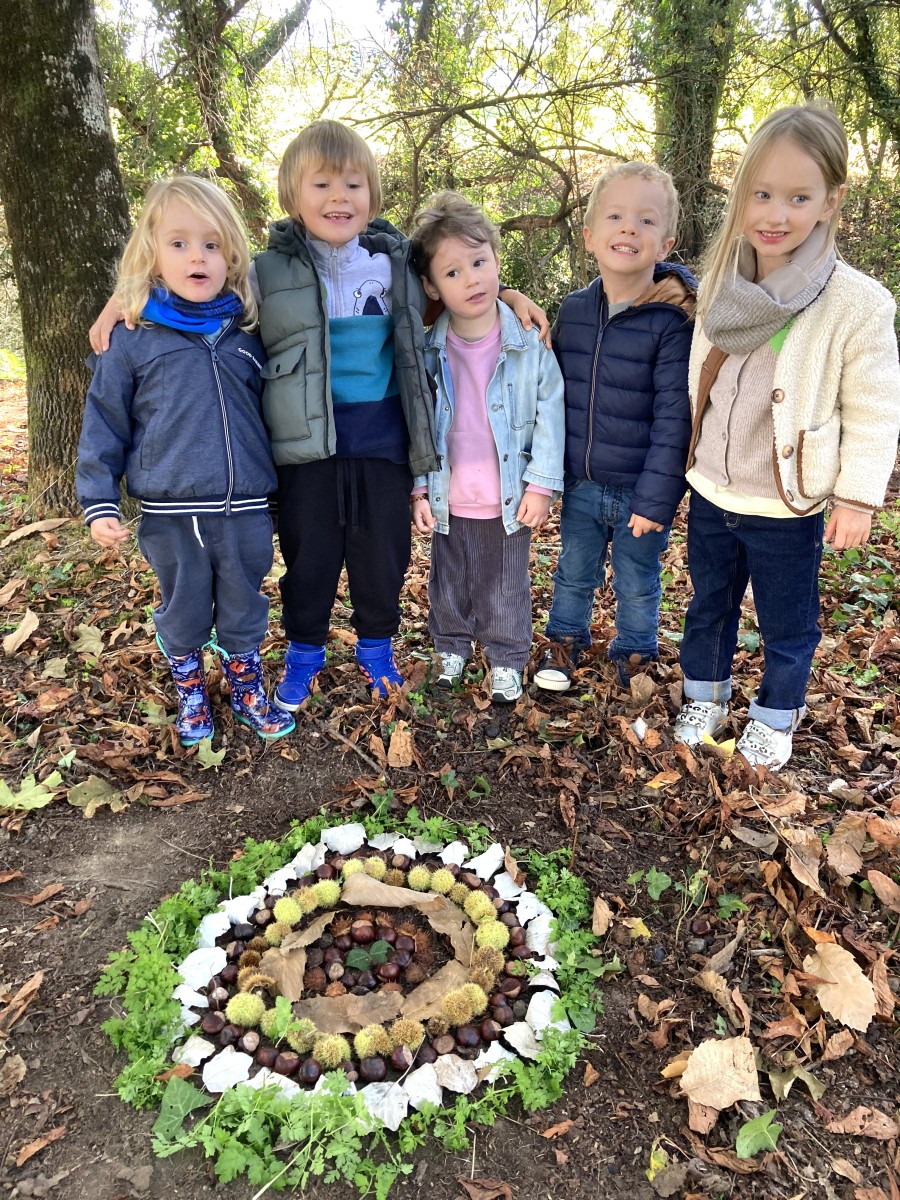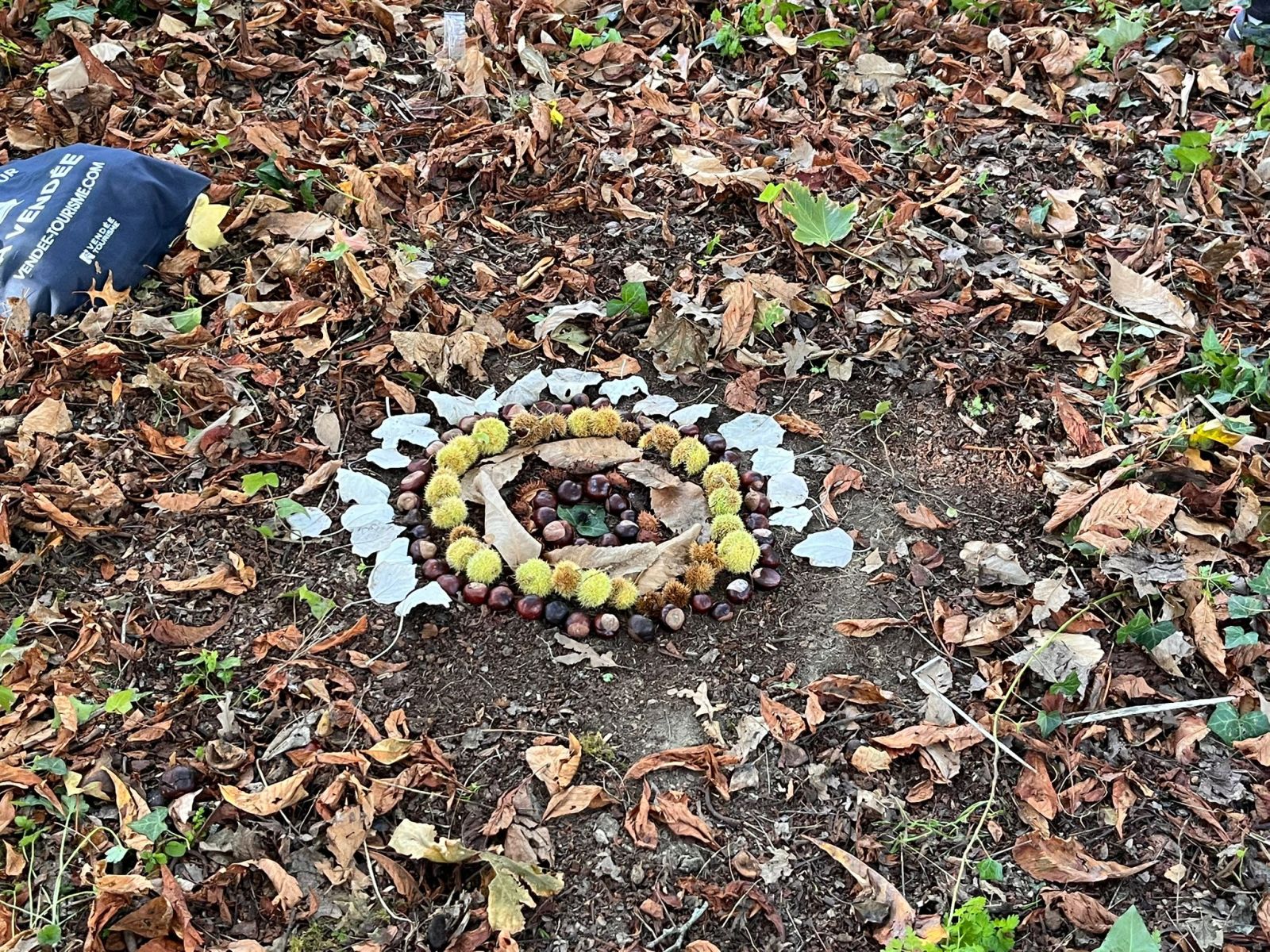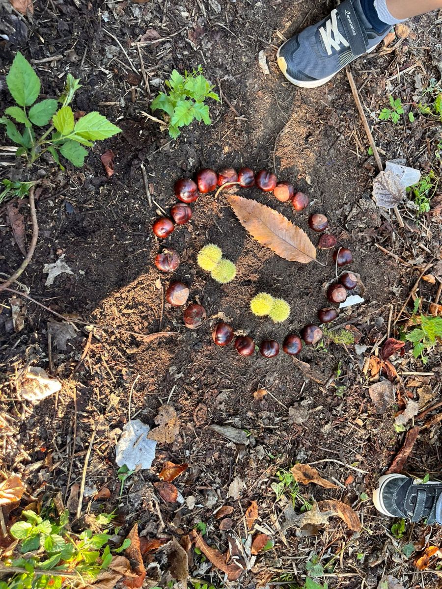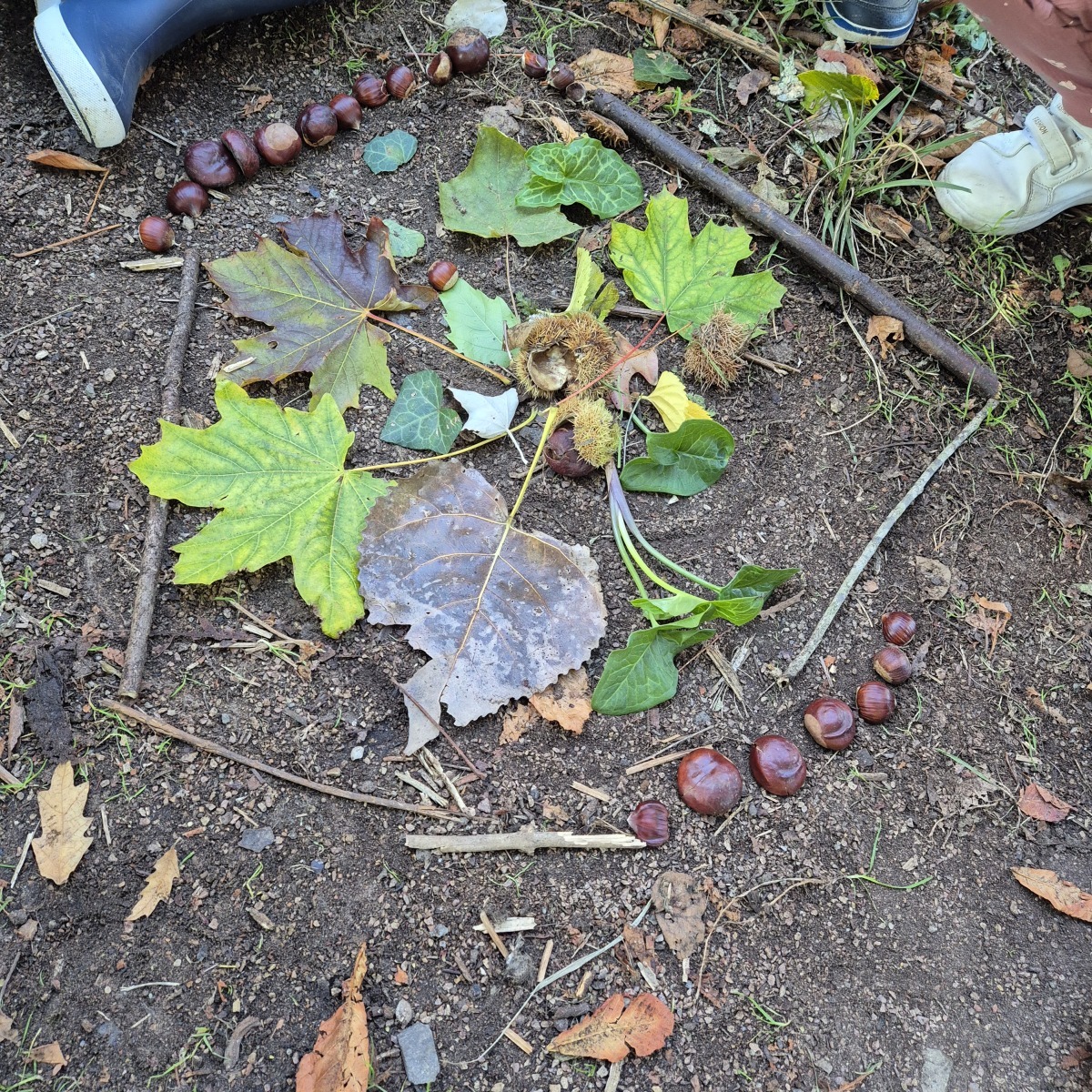 Après nos découvertes, nous avons profité de ce moment pour faire du Land Art :nous avons créé de jolis mandalas avec les trésors de la nature — des feuilles, des marrons, des bâtons, des cailloux, …